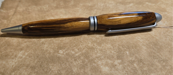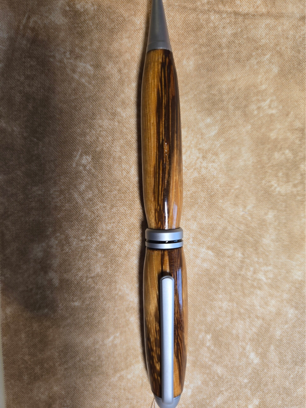 this pen is called summit (kit) hardware satin silver we are not sure of the kind of wood but it is a great mix of dark and light wood
