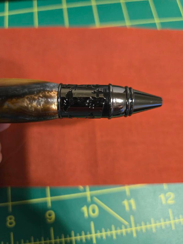 This is an orange and silver acrylic twist pen. The clip has a mummy laying in a coffin. It is a great pen for use, especially during the spooky season.